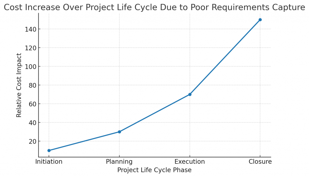 The cost to correct poor requirements capture. Note this can exceed the initial project cost if caught late in excution! (Author graphic)