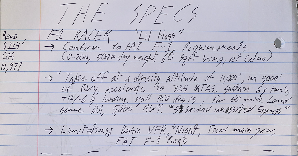 So, I needed a set of requirements that would deliver an airplane design that could be tested at my home field (a 6,000ft runway at an elevation 6,875ft MSL, with a summer density altitude of roughly 30,000 ft), could place well at the National Championship Air Race in Reno, and meet the aviation records body’s requirements for the Formula-1 class.  Too much and I’d be painted into a corner.  Too little, and I ran the risk of realizing halfway through welding and fiberglass layup that I had the wrong problem.